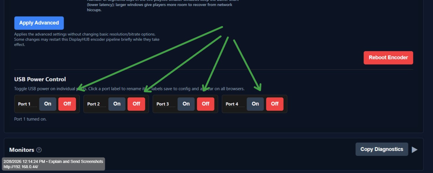 Some inputs will need an HDMI splitter, and sometimes those splitters have to be power cycled to get a new sync, and because we try to make it so that the encoders can be placed at the device where it might be currently located, getting physical access to the splitter might be difficult. We have created a way to remotely power cycle the USB ports on the Raspberry Pi. Yes, you can usually power the HDMI splitter from the Pi itself. By power cycling the USB port you can reset the devices that are powered by the Pi; thus, a new sync is established.